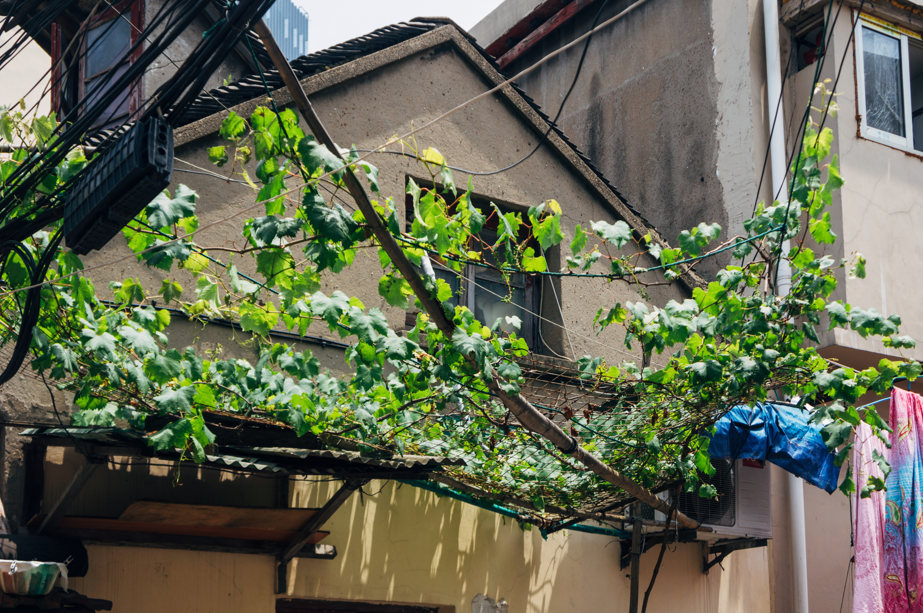 I grew up half in the village, half in reasonably modern apartment buildings. So I have no personal experience to cite for living in houses like this. But I remembered fondly the name it was referred to with: the South City 南市區. Condensed, packed, crowded, in a while it almost evokes the images of Shanghai Ghetto… small but fully-fledged, life carries on through those tiny lon-daon 弄堂 and alleys: restaurants, convenience stores 煙紙店, barbers 剃頭店, wet markets, schools, and the unnamed vines stretching through the webbed wires and windows.